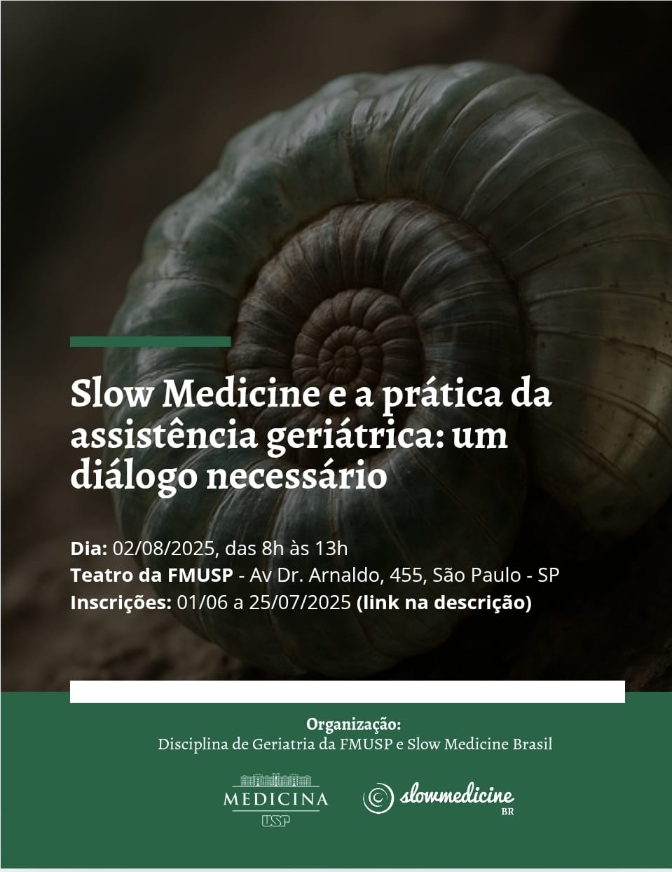 No dia 2 de agosto de 2025, sábado, das 8 às 13 horas, no teatro da Faculdade de Medicina da USP, a Disciplina de Geriatria da FMUSP e o movimento Slow Medicine Brasil promovem um encontro para discutir sobre como prestar cuidados em saúde de uma maneira sóbria, justa e respeitosa.